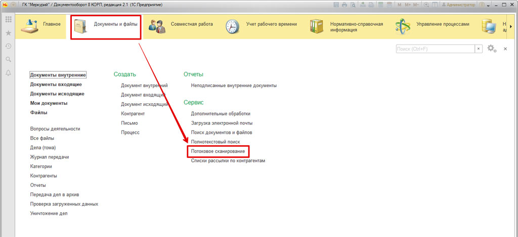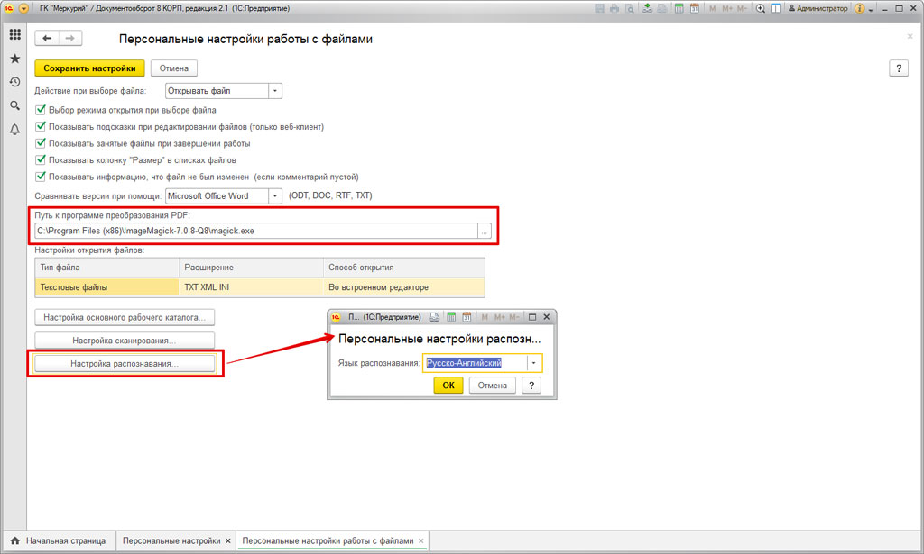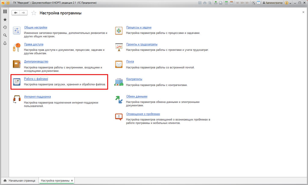 Чтобы распознавать документы в 1С:Документооборот, надо зайти в меню «Настройка и администрирование», перейти в раздел «Настройка программы» и выбрать пункт «Работа с файлами».
