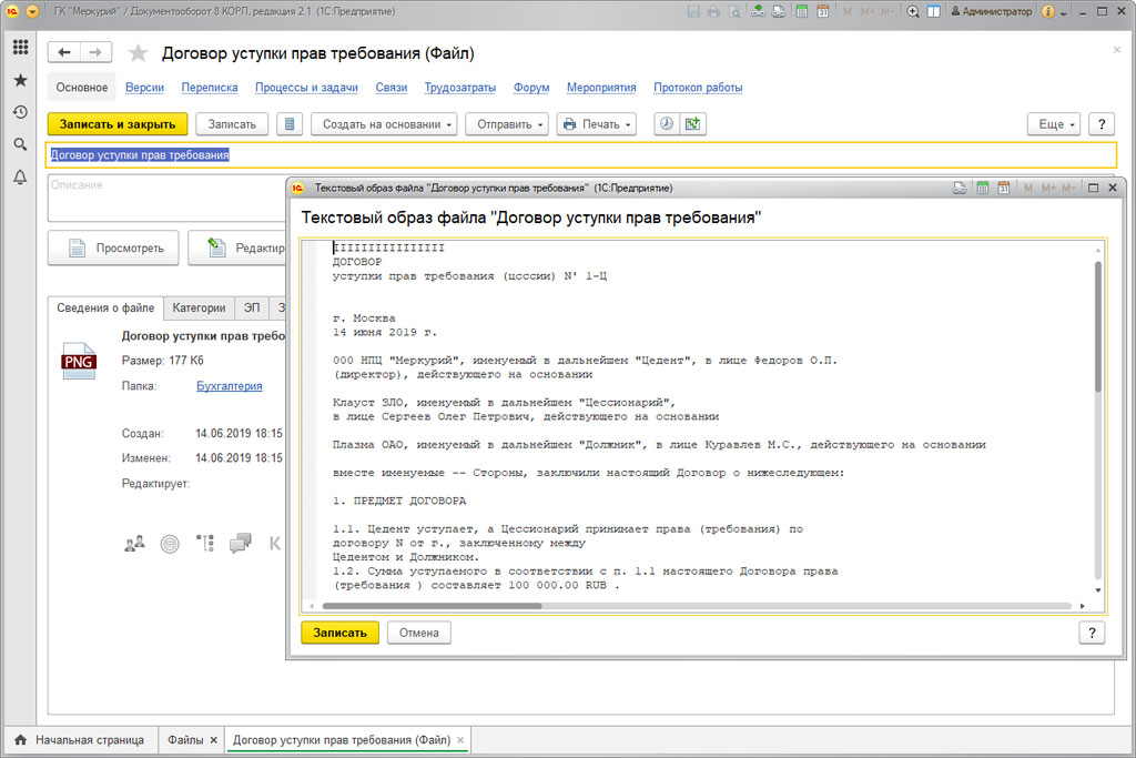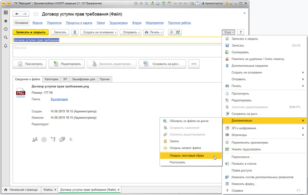 Когда распознавание файла завершено, он попадет в индексацию 1С:Документооборот. Это позволит быстро найти его через полнотекстовый поиск документов по вхождению фраз и слов. Пользователи смогут получить доступ к основной его версии в формате PNG.