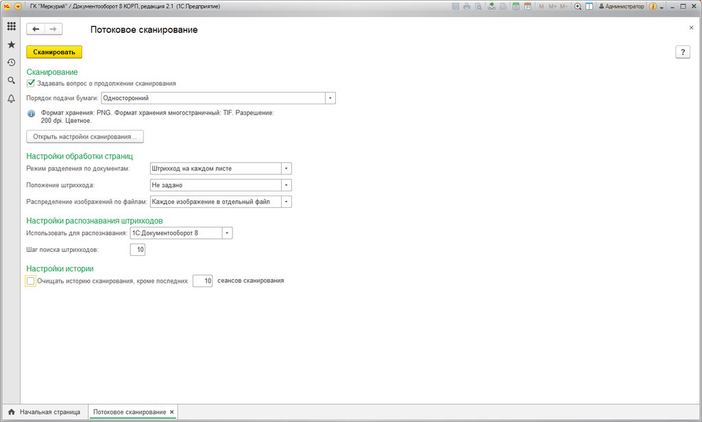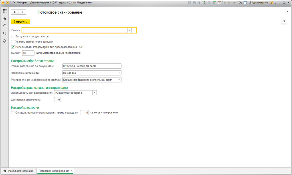 Чтобы загрузить документ непосредственно со сканера, надо установить нужные параметры. Можно настроить обработку страниц, распределение изображений по файлам, распознавание штриховых кодов, историю.