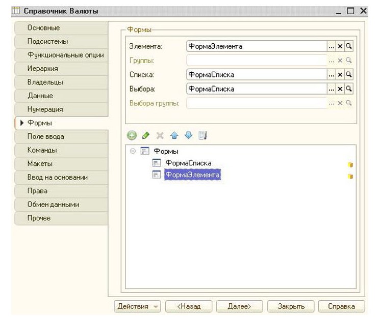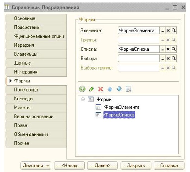 Интерфейсы, которые отображаются конечным пользователям, создаются разработчиками во вкладке «Формы». Зачастую встречаются формы Списка и Элемента: в таком виде пользователи 1С видят разные элементы и списки данных любого справочника.