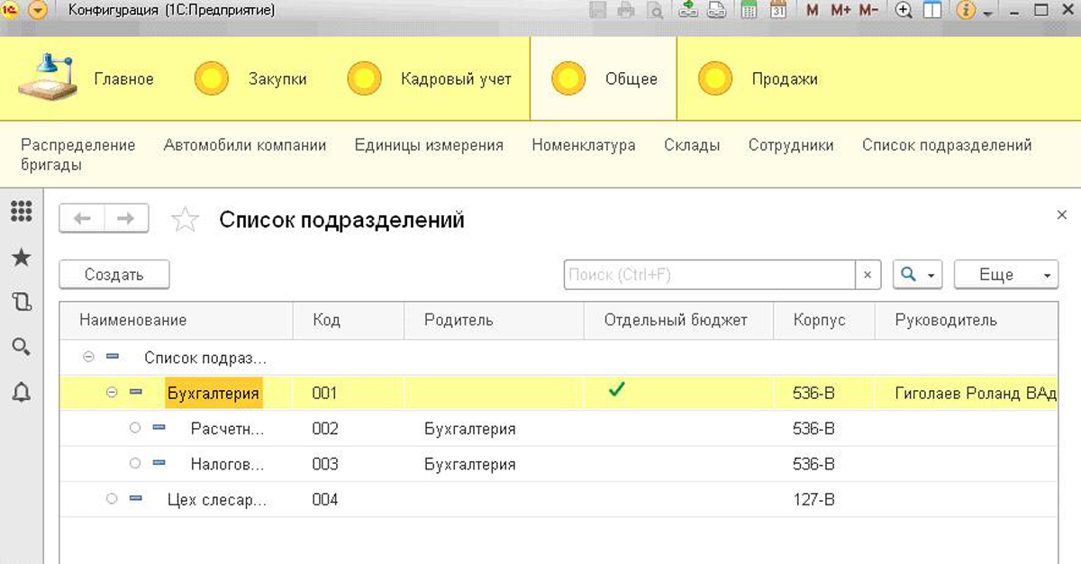 Демонстрационный справочник «Подразделения» – создан, благодаря последовательности вышеуказанных действий. Теперь обновляем конфигурацию и перезапускаем систему, только в этот раз в режиме предприятия. Подсистема «Общее» обзавелась теперь функциональной клавишей «Список подразделений». При ее нажатии, откроется ранее заданная нами форма списка справочника, в которую можно вносить элементы.