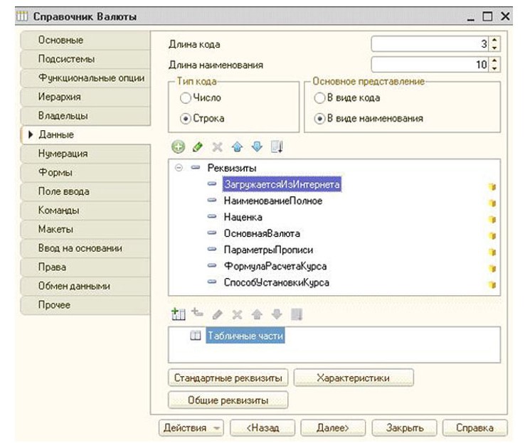 Вкладка «Данные» определяет характер информации, которая может быть добавлена в справочник 1С. Наименование и код настраивается сверху, что является стандартными реквизитами, а в центре – перечень добавленных реквизитов. Нижняя часть отображает табличные части справочника.