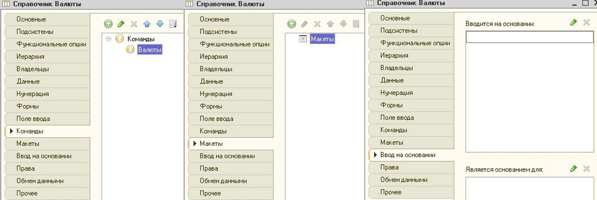 В разделе «Команды», находится перечень существующих кнопок, которые вызывают данный справочник. «Макеты» содержат все печатные формы конкретно взятого объекта конфигурации. «Ввод на основании» необходим лишь тогда, когда предполагается создание другого объекта конфигурации на основе элемента справочника.