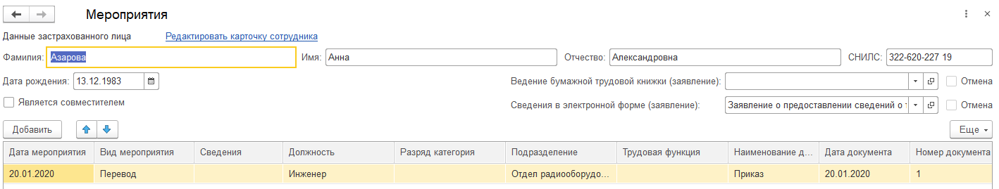 Данные заявления тоже попадут в форму отчетности автоматически. Если два раза нажать на конкретную строку, будет открыто окно. В нем будет указаны более подробные сведения о работнике и его мероприятиях.
