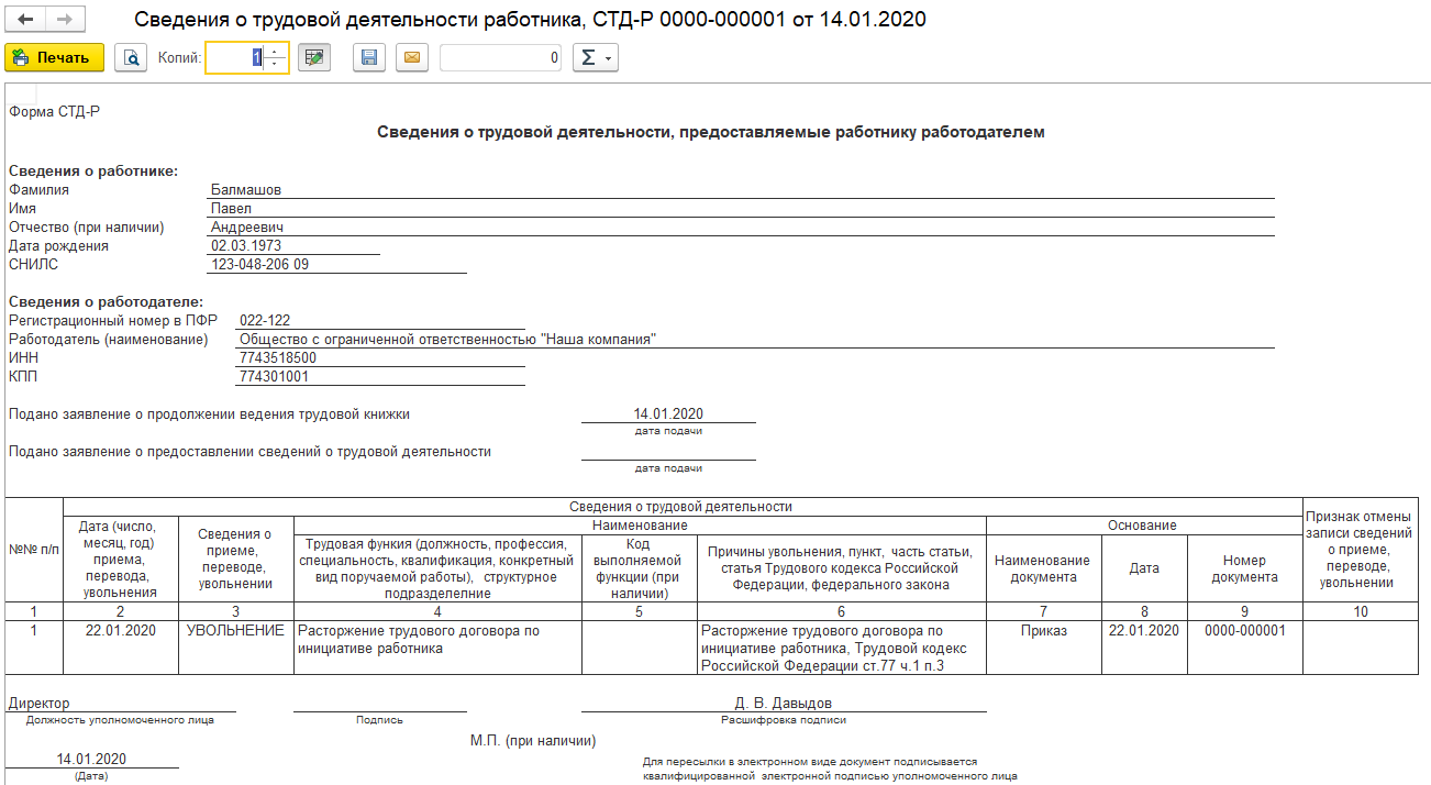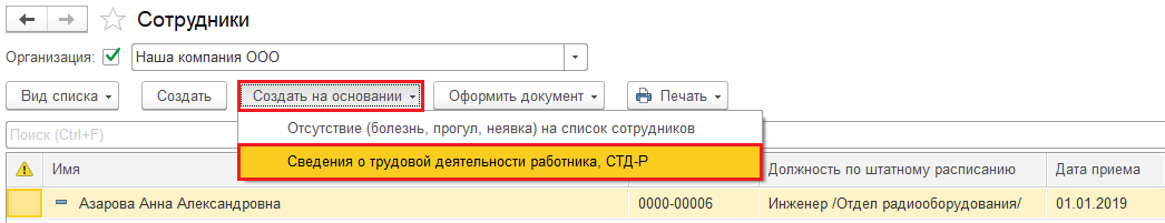 Например, это требуется при оформлении заявки на ссуду в банке. То есть СТД-Р заменит заверенную копию бумажной трудовой. Сделать ее можно из окна «Электронные трудовые книжки» с помощью клавиши «Создать» и на основании сотрудника в справочнике «Сотрудники» (он находится в разделе «Кадры»).