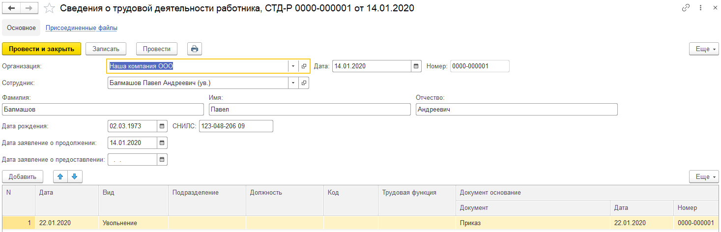 Если СТД-Р вносить на основании работника, то в открывшемся окне в автоматическом порядке будут заполнены личные сведения сотрудника, компания, в которой он работает, дата заполнения и информация о расторжении трудового договора.