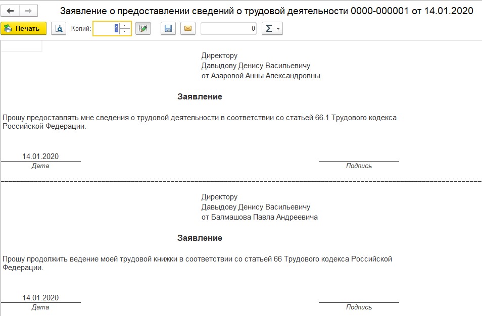 Далее нажмите «Создать» и из открывшегося перечня выберите пункт «Заявление о предоставлении сведений о трудовой деятельности». С помощью клавиш «Подбор» или «Добавить» потребуется ввести списком работников, которые предоставили заявления о переходе на трудовые книжки в электронном формате или о сохранении бумажного документа. В одном заявлении можно указывать сотрудников, которые выбрали разные варианты. Это показано на рисунку ниже.