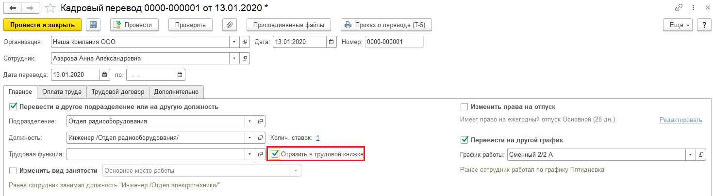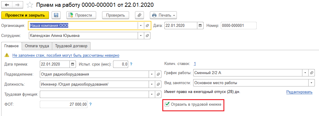Для того, чтобы форма заполнялась автоматически, нужно в кадровых документах устанавливать флаг «Отразить в трудовой книжке». Для рассмотрения заполнения формы СЗВ-ТД будут созданы три документа: прием на работу, кадровый перевод и увольнение.