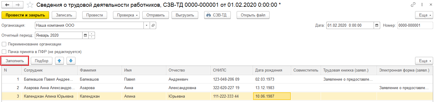 Если вы забудете установить флаг об отражении операции в трудовой книге, форма не будет заполнена в автоматическом режиме. Остановимся на создании отчета СЗВ-ТД в 1С. Его можно ввести из пункта «Электронные трудовые книжки», из раздела «Кадры» или из «Отчётность, справки». Далее выберите отчетный период и нажмите на клавишу «Заполнить».