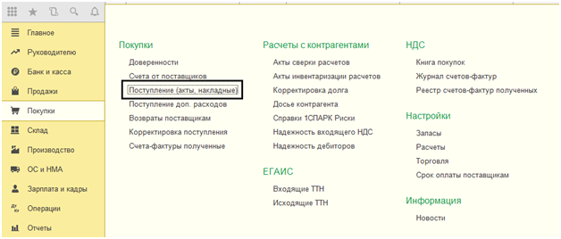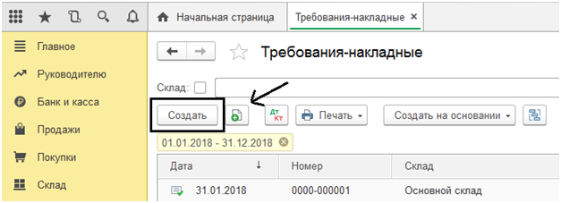 Чтобы создать документ нужно зайти во вкладку меню «Склад» и перейти по ссылке в журнал документов «Требования-накладные».