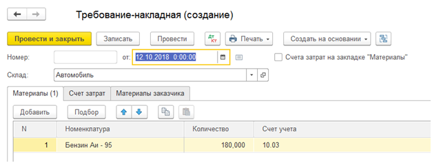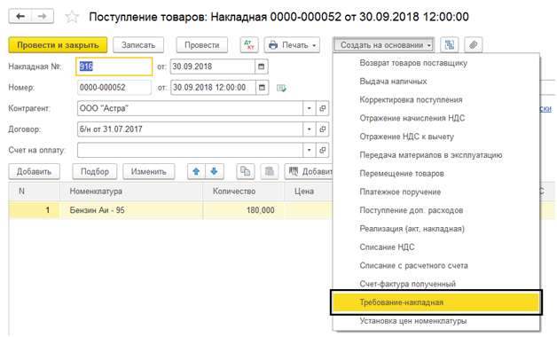 Документ, который мы рассматриваем в качестве примера, можно ввести согласно документу «Поступление», который был оформлен ранее. Для этого его необходимо открыть документ поступления и кликнуть на «Создать на основании». Затем из появившегося перечня надо выбрать «Требование-накладную» и в случае необходимости исправить этот документ.