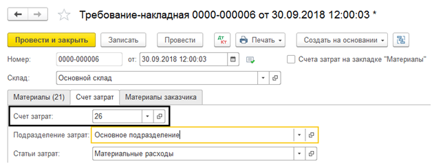 Обратите внимание на то, что в случае, если не будет поставлена галочка в графе «Счета затрат на закладке «Материалы», то счета списания придётся заполнять в отдельной закладке документа в соответствии с учётной политикой вашего предприятия.