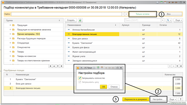Если во вкладке «Настройка» стоит галочка в графе «Запрашивать количество», то при выборе номенклатуры отобразится диалоговое окно, в котором указывается число единиц для добавления в документ. Затем, благодаря команде «Перенести в документ», они оказываются в табличной части.