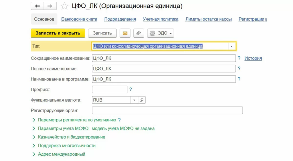 Это измерение имеет тип справочника «Структура предприятия», из чего следует важный методологический вывод: вся финансовая структура компании в 1С:ERP должна быть описана именно в справочнике «Структура предприятия».