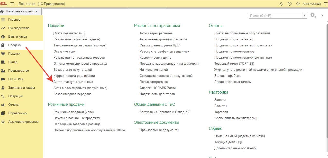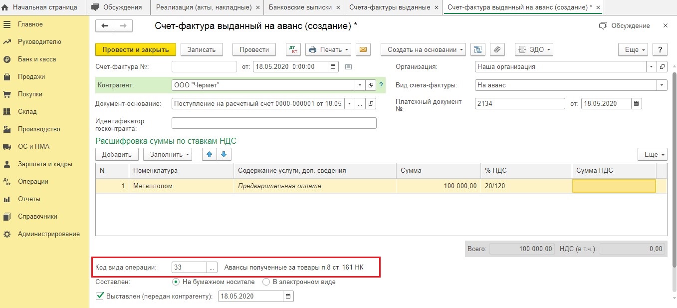 Поскольку в документе "Поступление на расчетный счет" нет точной суммы налога, то не получится создать обычным способом "Счет-фактуру выданный". В такой ситуации счет-фактура на сумму полученной предоплаты оформляется ручным способом. Это делается по гиперссылке "Счета-фактуры выданные", которая есть в разделе "Продажи".