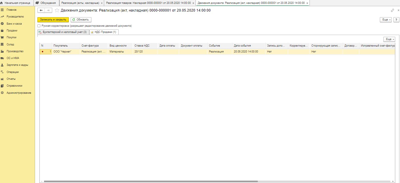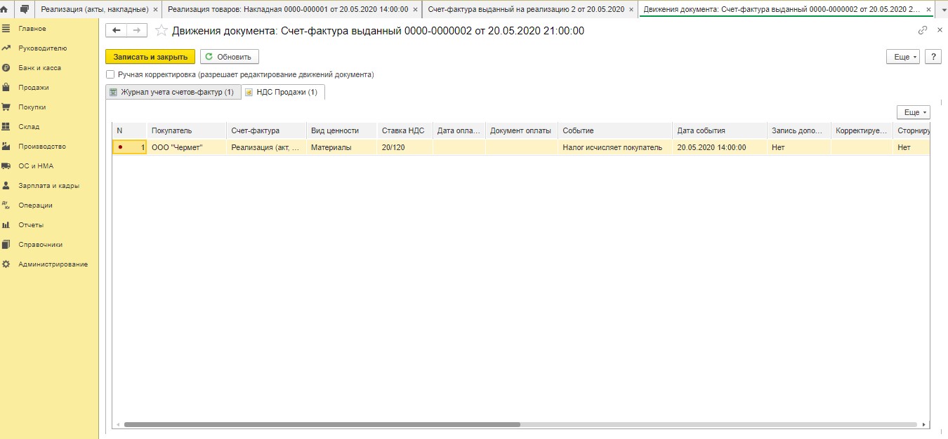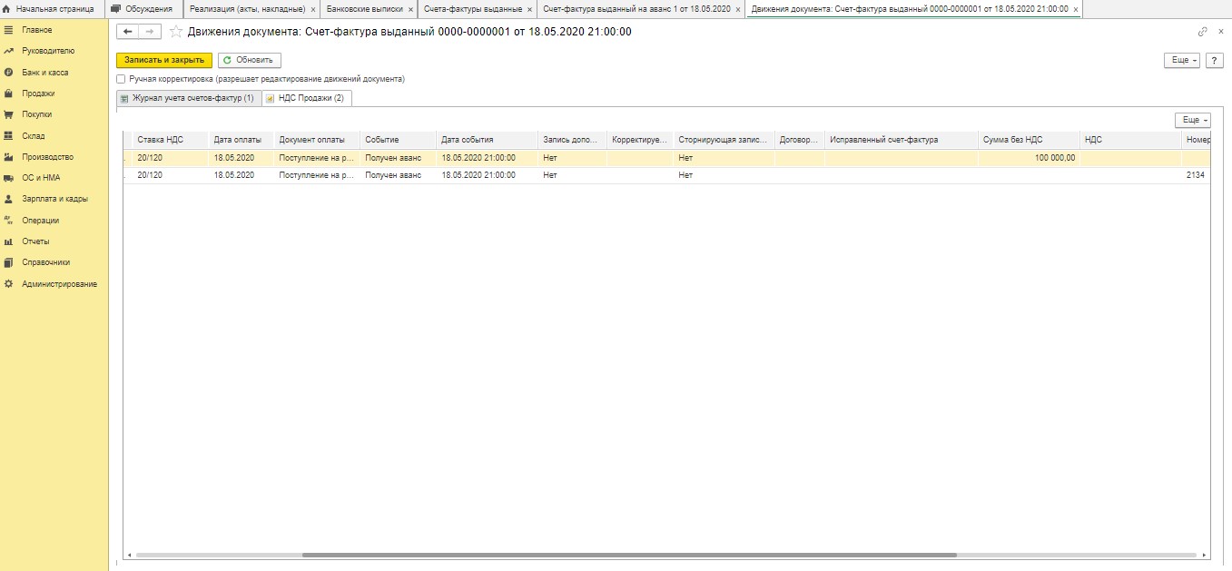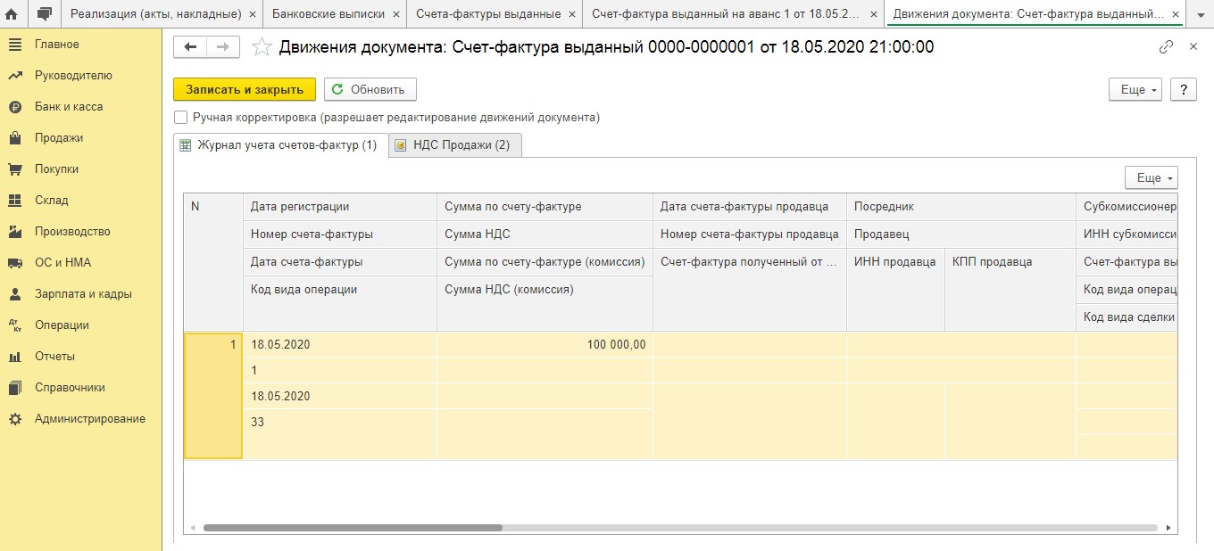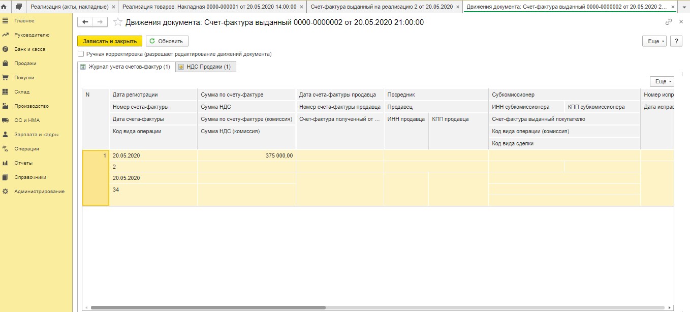 После проведения документа в регистр сведений "Журнал учета счетов-фактур" вносится запись. Дополнительно в регистр "НДС Продажи" вносится соответствующая информация.