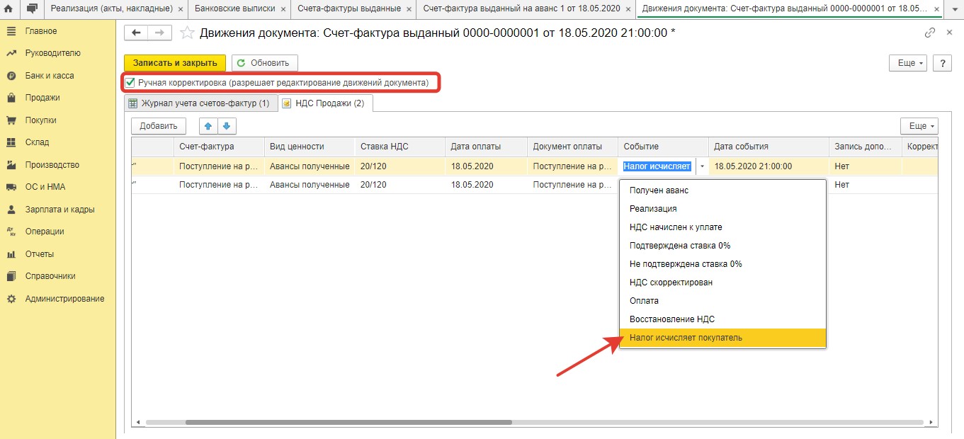 Далее надо войти в режим корректировки движений документации. Здесь требуется поставить отметку "Ручная корректировка". Далее заполняющему нужно исправить показатель "Получен аванс" на "Налог исчисляет покупатель".