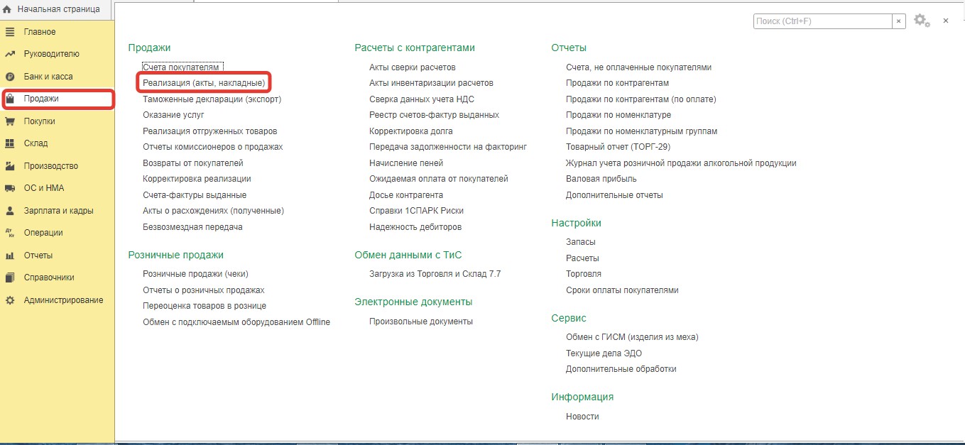 После осуществления отгрузки лома следует создать новый документ "Реализация".