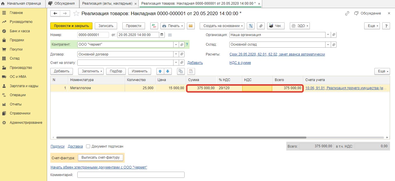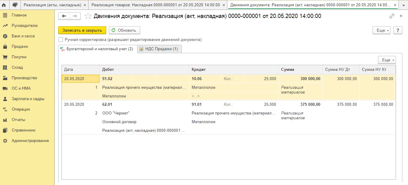 Учет продажи металлолома в 1С