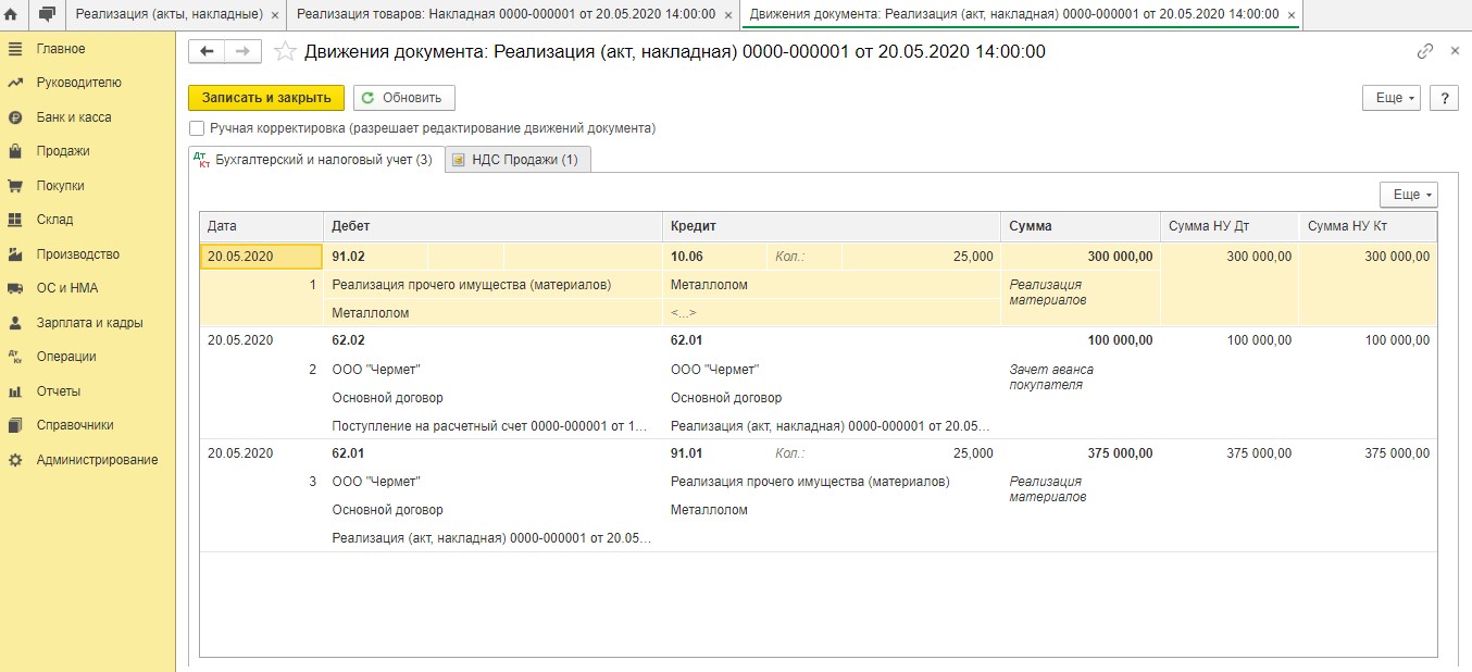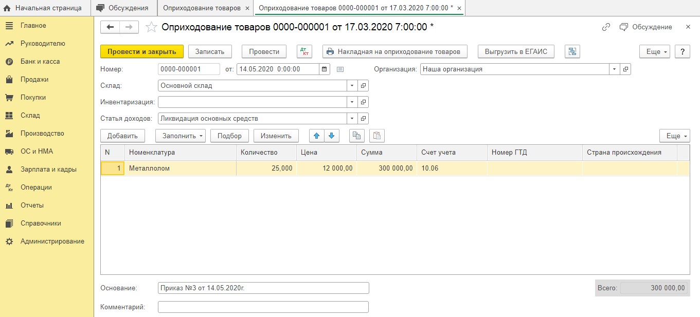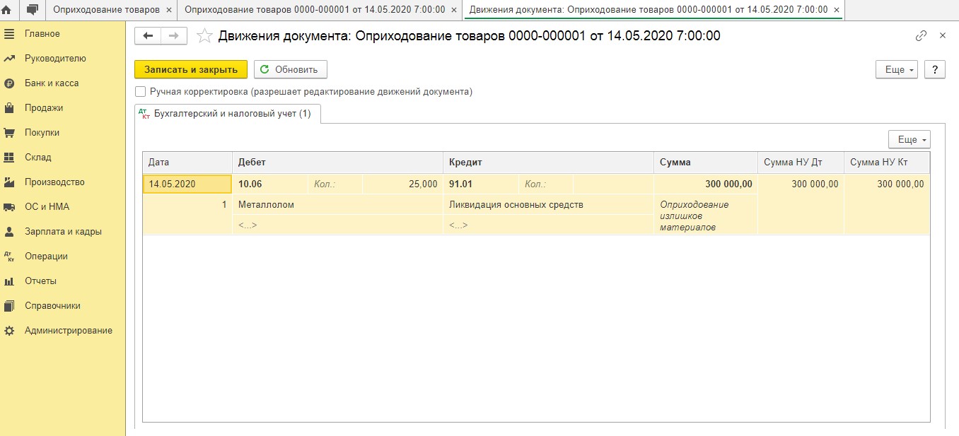 При этом акт комиссии об оприходовании металлолома выступает главным основанием для составления этого документа. Сразу после проведения документа данная программа создает следующую проводку: