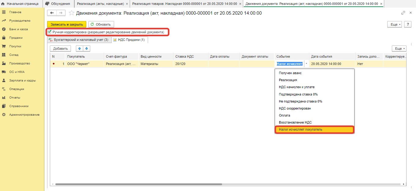 После этого пользователь должен оказаться в режиме ручной корректировки движений определенного документа. Потом, войдя в регистр "НДС Продажи", надо заменить значение "Реализация" на показатель "Налог исчисляет покупатель".