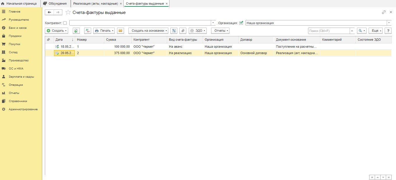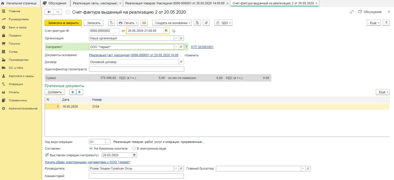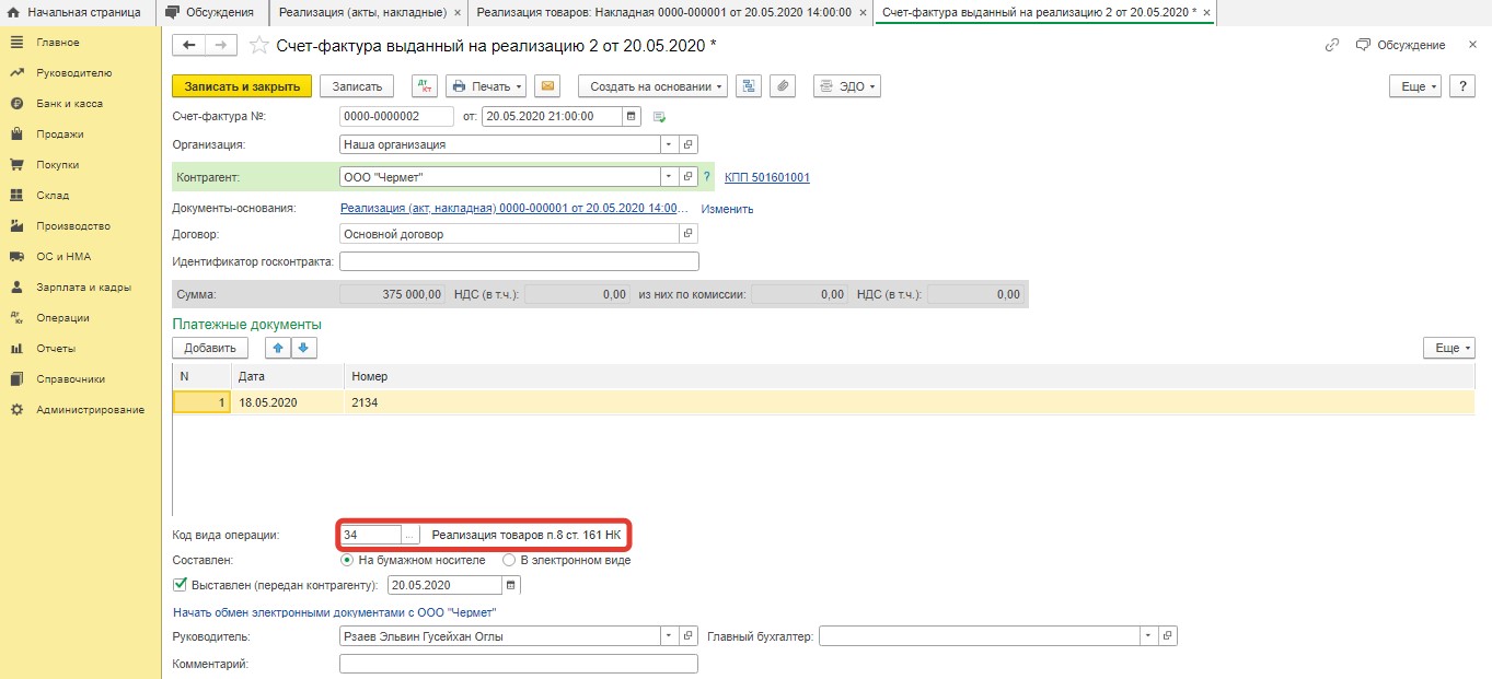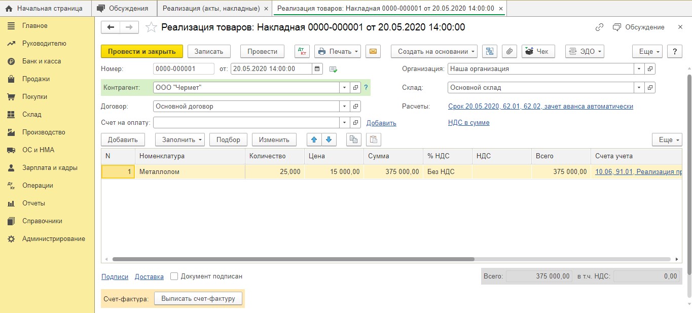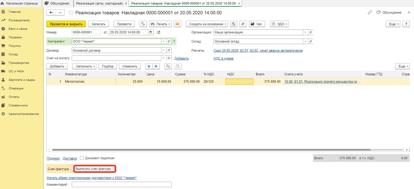 Потом пользователю следует нажать опцию "Записать и закрыть". После этого он вернется в документ "Реализация". Внизу есть кнопка под названием "Выписать счет-фактуру".
