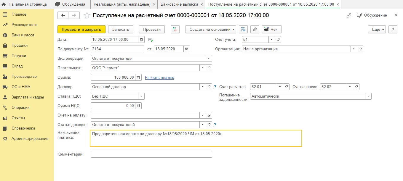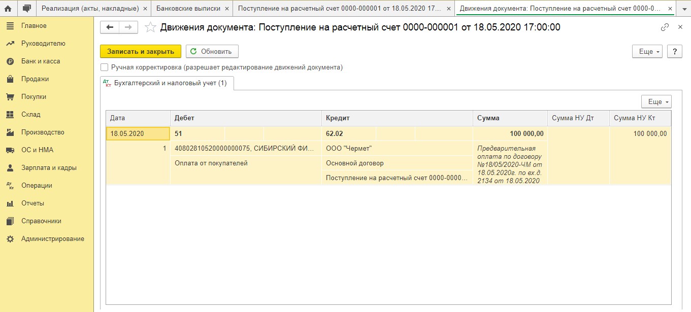 После того, как документ был проведен, данной программой будут сформированы проводки на сумму предоплаты, которая поступила без учета налога.