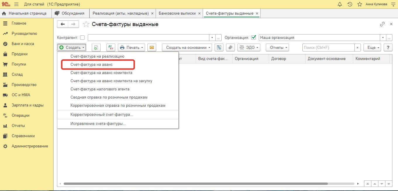 Посредством кнопки "Создать" нужно выбрать опцию "Счет-фактура на аванс".