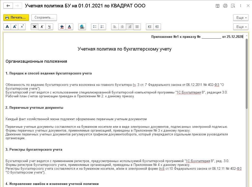 Учетная политика в 2021 году в программе 1С:Бухгалтерия 8