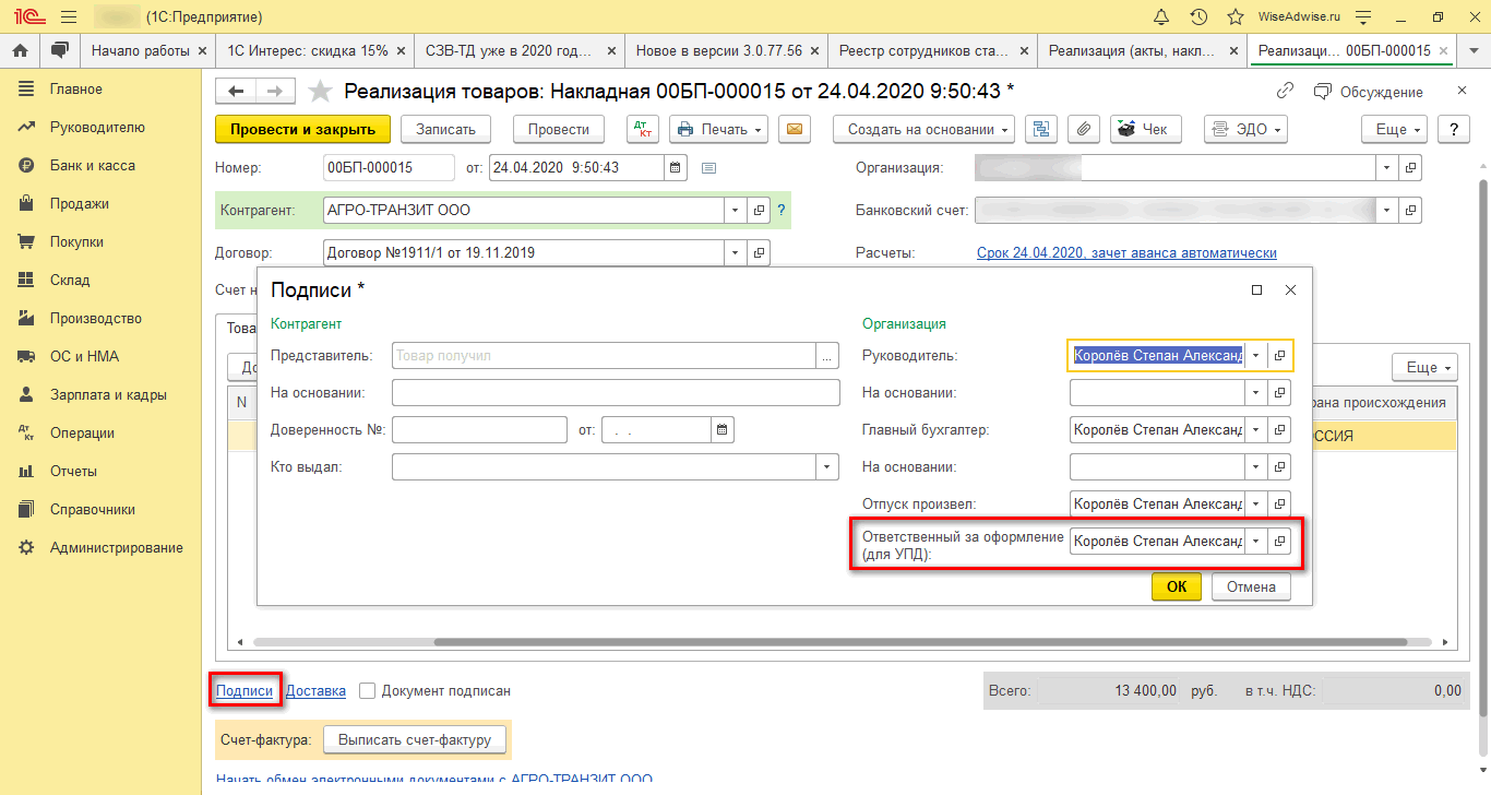 После необходимо указать подписанта универсальных передаточных документов в дополнительной вкладке.