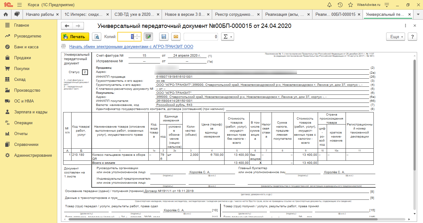 Для создания универсальных передаточных документов можно использовать печатную форму в документе реализации.