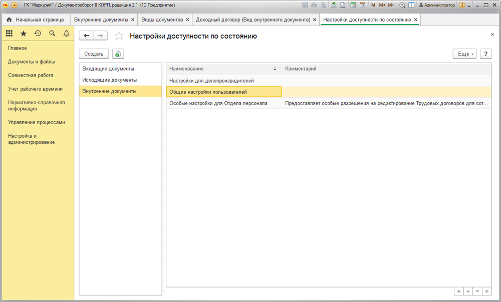 Чтобы настроить права доступа, следует обратиться к разделу «Настройка и администрирование» (п. «Настройка доступности по состоянию»).