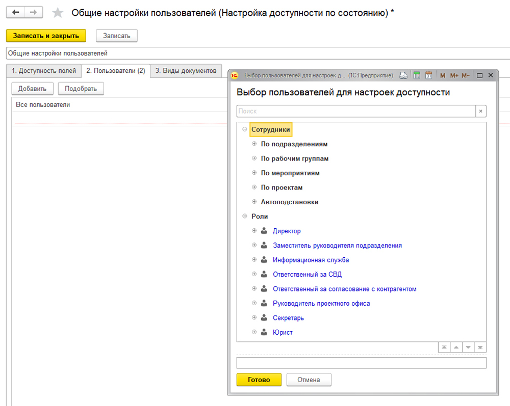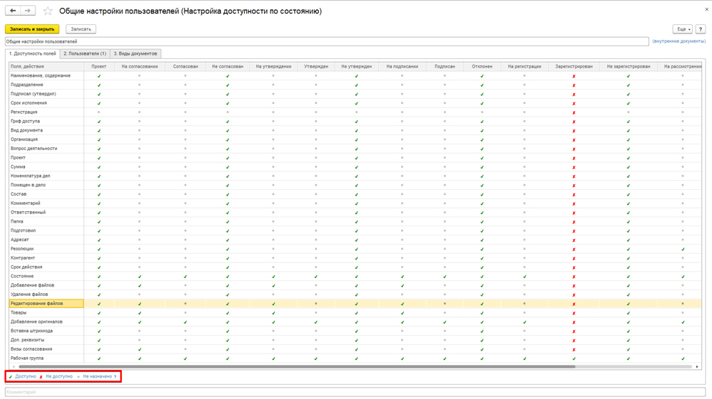 Здесь можно установить доступность каждого поля для любого пользователя в зависимости от статуса документа.