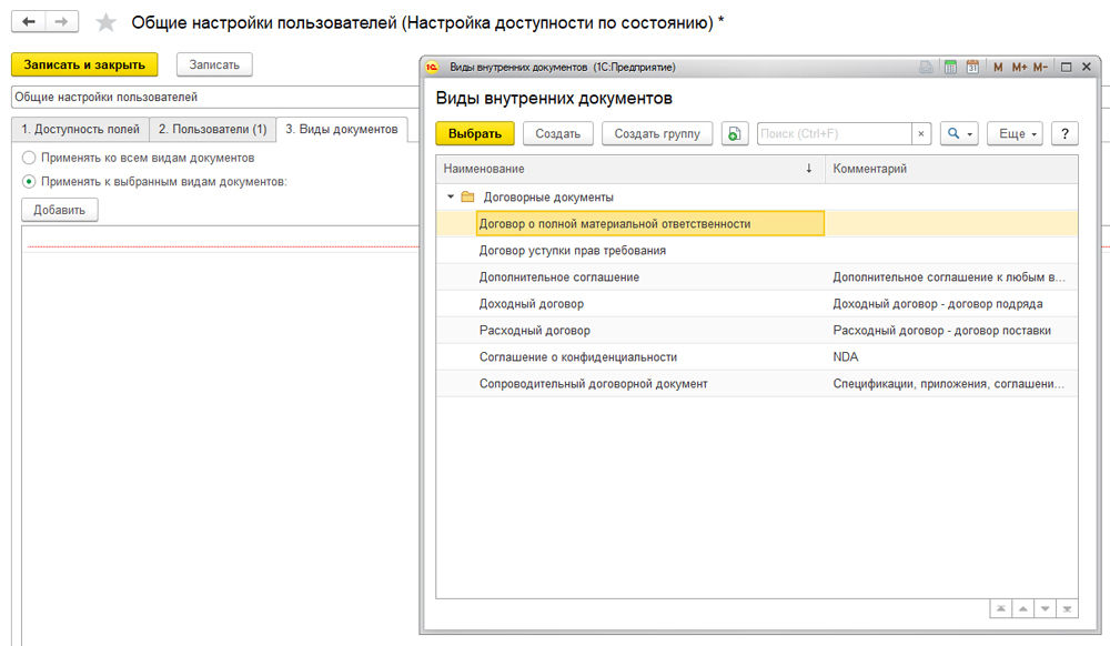 Также нужно определиться, имеет ли смысл делать разграничение прав на уровне всех документов, сопровождающих процесс договорной работы. Таких бумаг, как правило, намного больше, поэтому в случае, если будет принято положительное решение, то сервер 1С будет сильно загружен, что замедлит работу. Но если разграничивать права доступа все-таки необходимо, то следует проставить флажки: