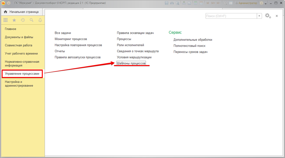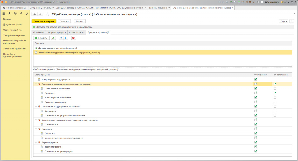 В последнем случае необходимо сформировать шаблон комплексного бизнес-процесса (раздел «Управление бизнес-процессами», п. «Шаблоны процессов»).
