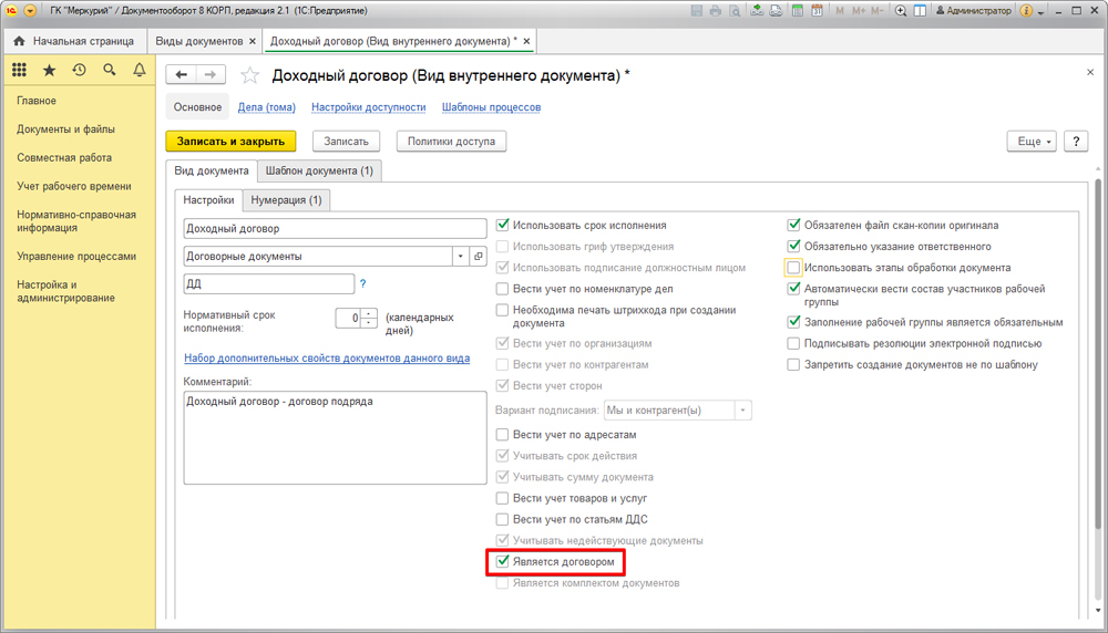 Для того, чтобы документ, который вы хотите поместить в дерево папок с договорами, был соответствующим образом классифицирован, следует указать признак «Является договором».