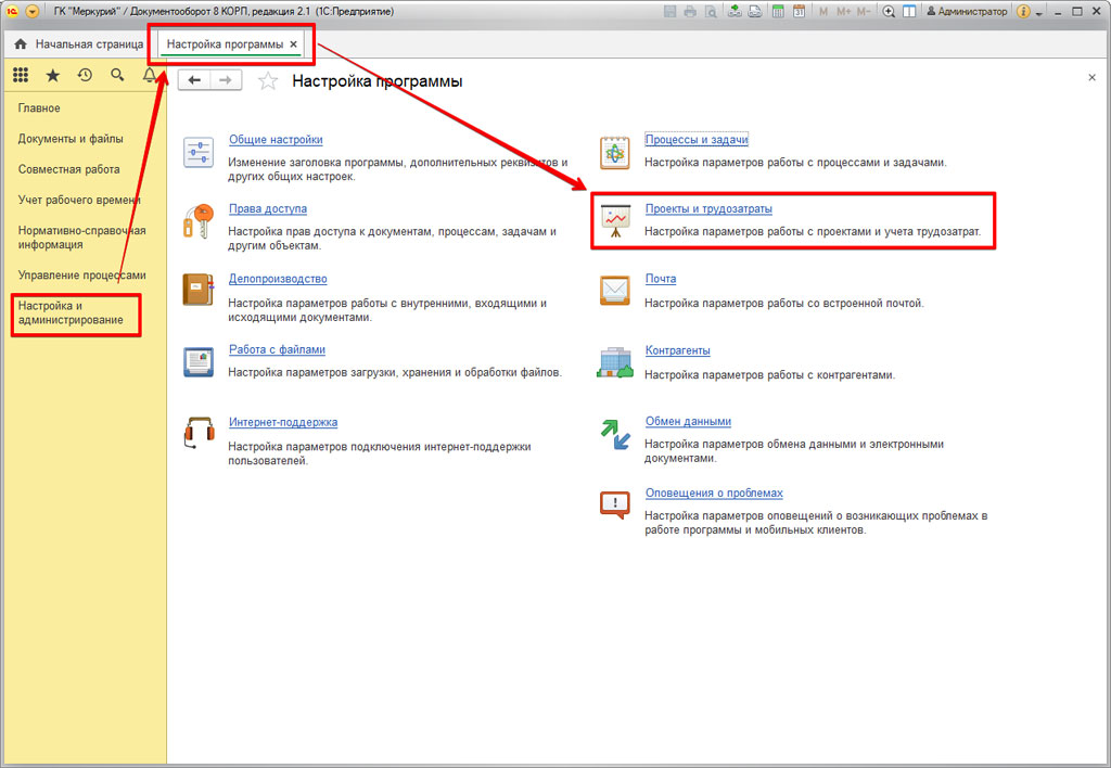 Чтобы начать проект в программе необходимо, для начала, активировать подсистему в меню программы «Настройка», выбрать раздел «Настройка и администрирование», затем выбрать параметр «Вести учет по проектам» в закладке «Проекты и трудозатраты».