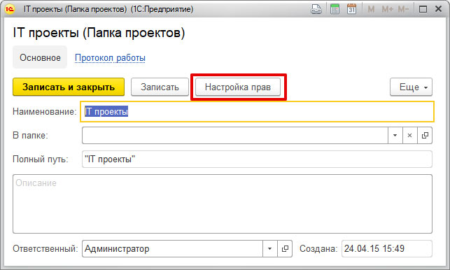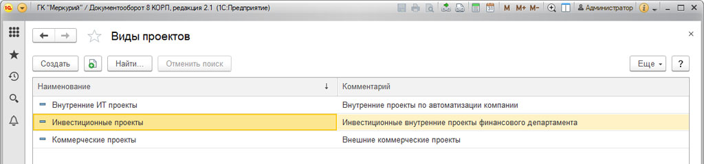 Параметр системы «Использовать виды проектов» обеспечивает группировку проектов не только по основным параметрам, но и позволяет устанавливать разграничение прав по каждому проекту, возможность создания дополнительных свойств и реквизитов не только для проекта в целом, но и отдельно для каждой проектной задачи.