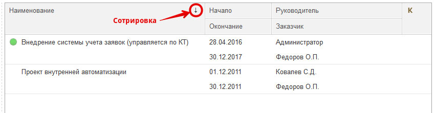 Сам список проектов можно сортировать списком в каждой колонке, для этого нужно просто нажать на заголовок, повторное нажатие меняет порядок сортировки списков.