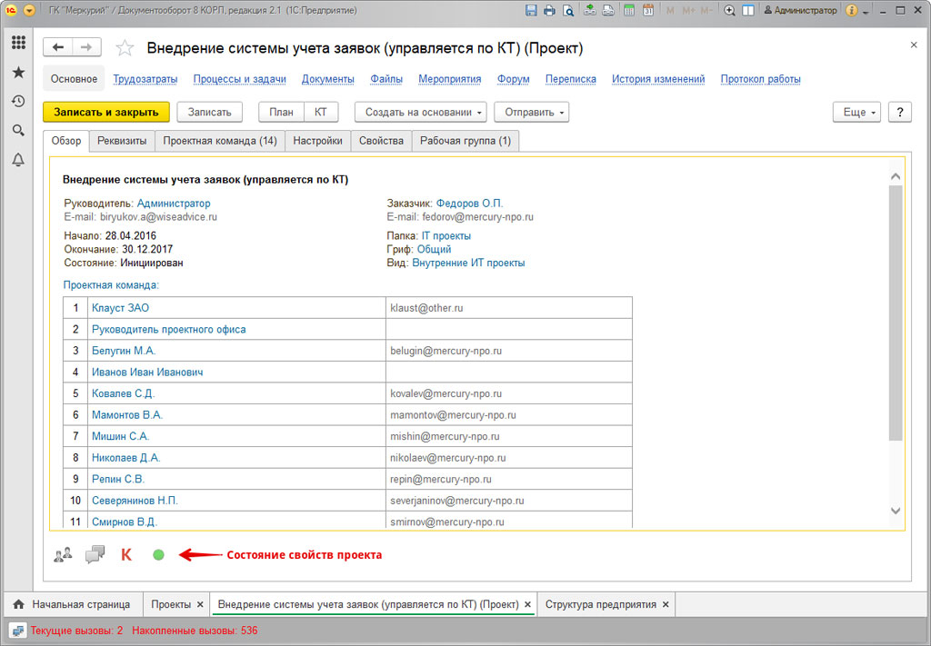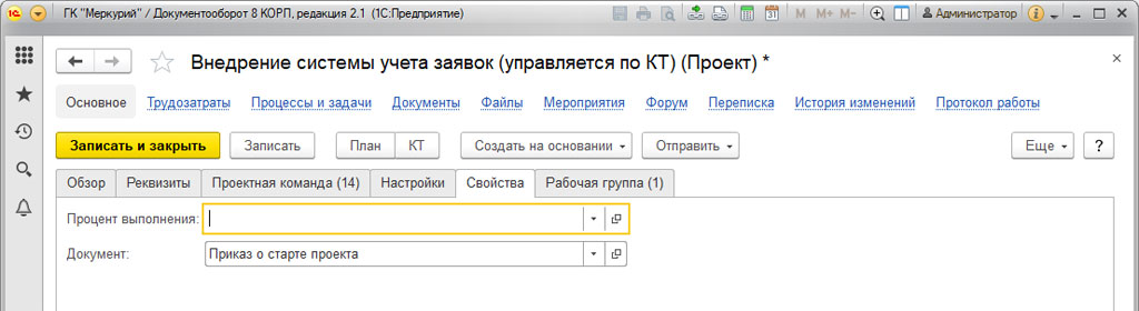 Следующая вкладка представляет собой информацию об основных реквизитах карточки проекта.