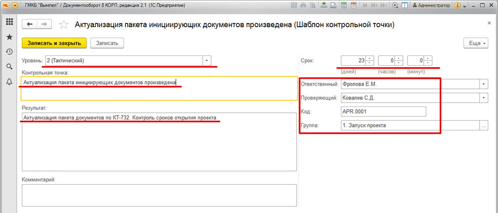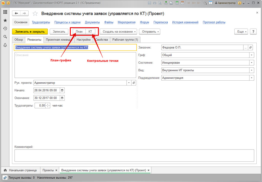 В данном разделе необходимо заполнить всю основную информацию: название, руководитель, начало и окончание проекта, трудозатраты и прочее. Заказчиком в данном случае может выступить как контрагент, так и внутренний пользователь. В верхней части окна отражаются команды, с помощью которых можно перейти к списку контрольных точек либо непосредственно к плану-графику проекта. Здесь же располагается кнопка создания связанных объектов и запуска процессов по всему проекту.