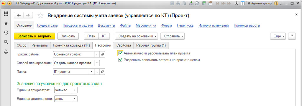 В список проектной команды могут быть внесены любые участники: как представители контрагента, так и внутренние пользователи. Выбрав вкладку «Настройки», можно установить способ планирования, график работы по проекту, выбрать саму папку проекта.