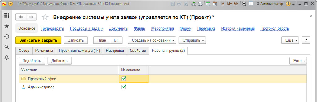 Данные о пользователях, группах, имеющих доступ к проекту, редактирование данных – все это можно сделать, открыв вкладку «Рабочая группа». Если указанная таблица незаполнена, то проект видят все пользователи системы без исключения.