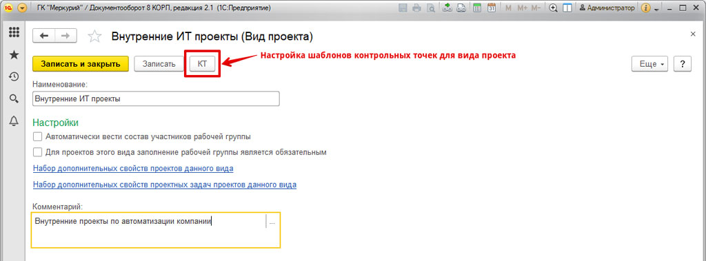 Контрольная точка в шаблоне обозначается кратко «КТ» и представляет собой результат, который подлежит контролю. Кроме того, можно настроить плановый срок контроля, указать ответственного за «КТ», проверяющего, установить кодировку «КТ» и указать группу, которая принадлежит к этой контрольной точке. В разделе «Совместная работа-Проекты» можно выбрать список проектов.