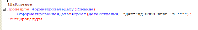 Для иллюстрации примера форматирования даты создадим функцию-обработчик &НаКлиенте, которая будет выводить дату в нужном нам формате. Для этого в обработке создадим: