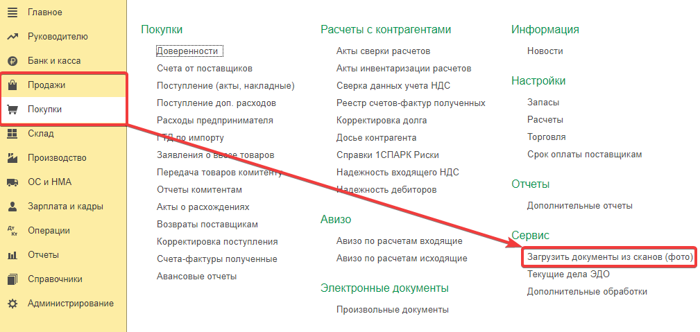 На данный момент пользователи могут использовать сервис для распознавания таких документов как счета-фактуры, накладные торг-12, УПД, акты, счета на оплату. Для загрузки документов из скан-копий или фото нужно зайти через главное меню в раздел "Продажи" или в раздел "Покупки", затем выбрать вкладку "Сервис" и перейти по ссылке "Загрузить документы из сканов (фото)".