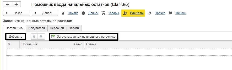 «Шаг 3» предназначен для внесения сведений о наличии дебиторской и кредиторской задолженностей. Здесь показываются расчеты с поставщиками, покупателями, персоналом, а также данные о расчетах по налогам и эквайрингу. Каждой группе соответствует отдельная вкладка.