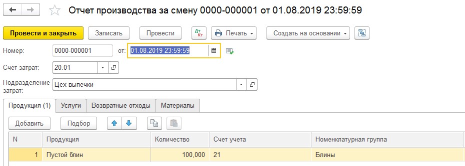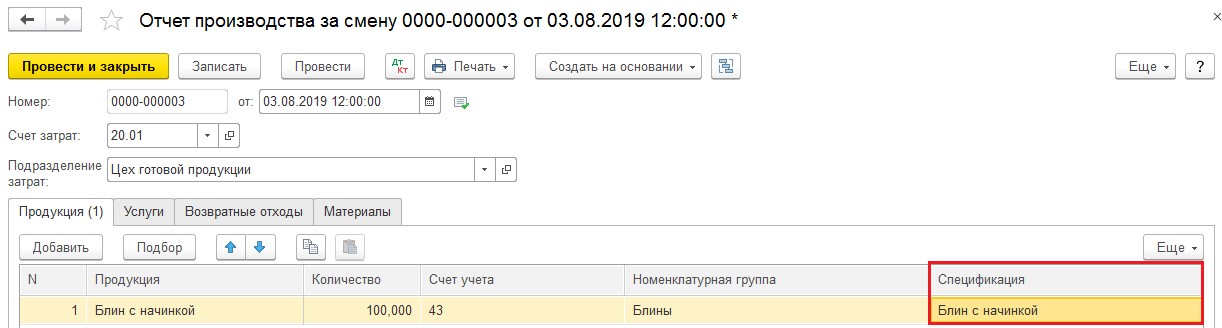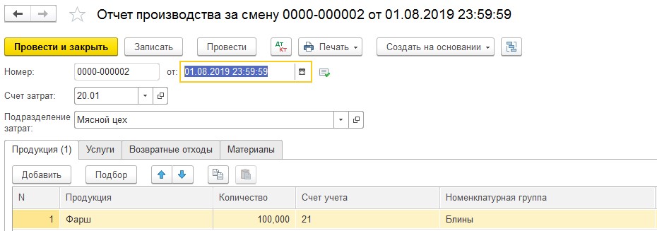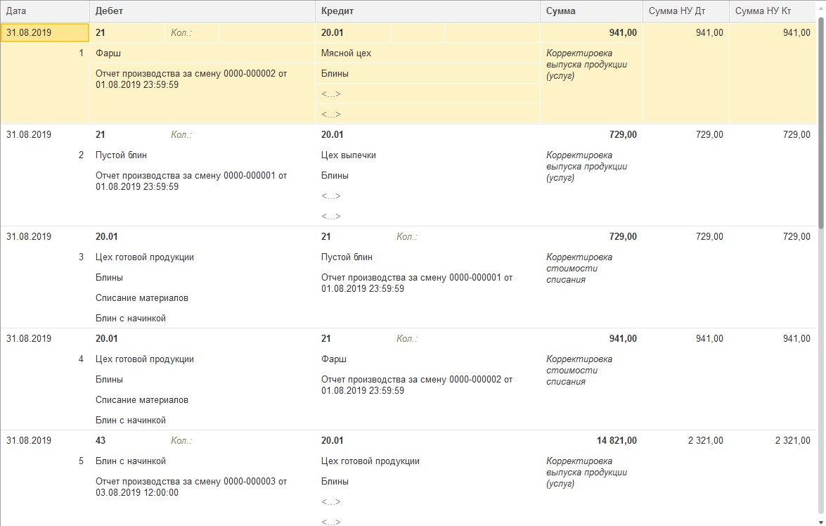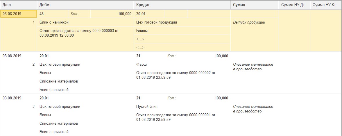 Рассмотрим пример: организация осуществляет изготовление фарша и блинчиков (полуфабрикатов) и готовит мясные блины. По всем вариантам применяемых продуктов оформленный документ сформирует проводки Дт 20.01 Кт 10.01.