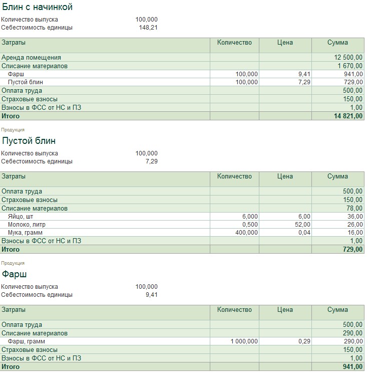 В рассматриваемом нами примере, себестоимость мясных блинчиков зависела от страховых взносов и заработной платы работников производственного цеха, списанных фарша и пустых блинов, арендной платы за помещения.