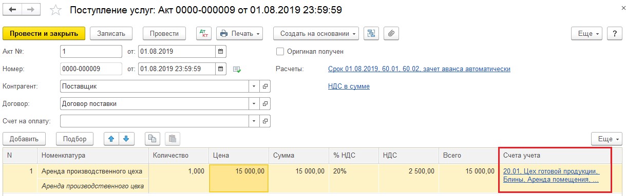Внесем новый вариант затрат – арендная плата за помещения. С этой целью выберем подраздел «Поступление (акты, накладные)», расположенный в меню «Покупок». Теперь выбираем подраздел «Услуги (акт)» (появится в выпадающем списке после нажатия на «Поступление». Необходимо правильно указать номенклатурную категорию и счет расходов. В противном случае расходы могут не сказаться на себестоимости продукцию. Оформленный акт сформирует проводки Дт 19.04 Кт 60.01 и Дт 20.01 Кт 60.01 на величину выделенного Налога на Добавленную Стоимость (при условии, что НДС не входит в себестоимость, как при ЕНВД и на «упрощенке»).